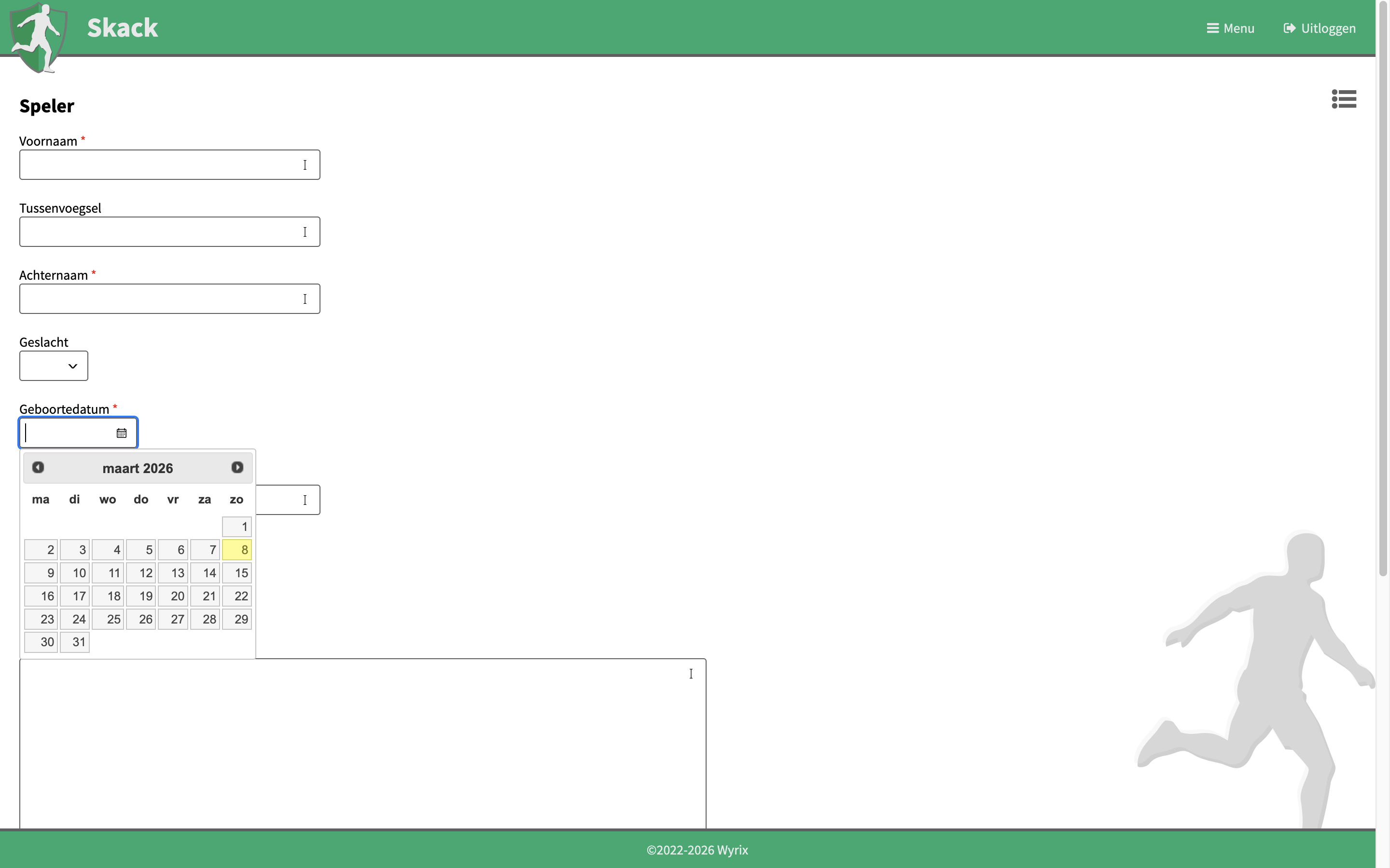 Voeg eenvoudig spelers en kaderleden toe aan je seizoen middels de vriendelijke formulieren. Slechts enkele velden zijn verplicht om in te vullen, maar het systeem is zo compleet mogelijk zodat je (indien jij dat wenst) ook aanvullende informatie kunt opslaan zoals allergieën, opmerkingen et cetera.